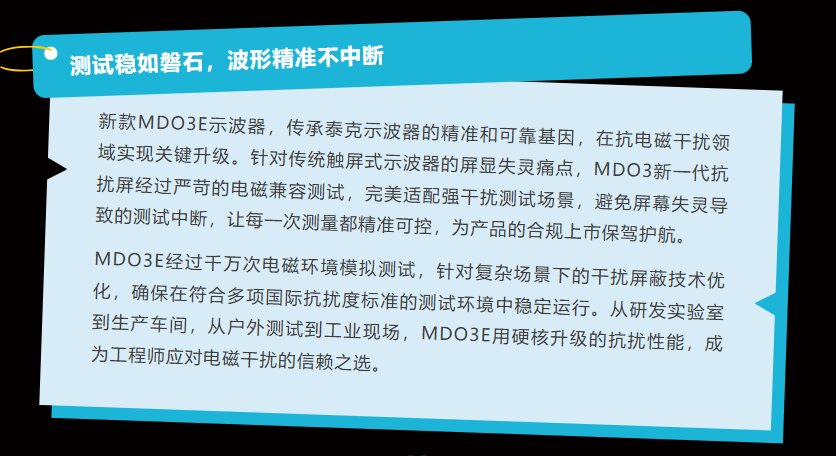 新款MDO3E示波器,传承泰克示波器的精准和可靠基因,在抗电磁干扰领域实现关键升级。 针对传统触屏式示波器的屏显失灵痛点,MDO3新一代抗扰屏经过严苛的电磁兼容测试,完美适配强干扰测试场景,避免屏幕失灵导致的测试中断,让每一次测量都精准可控,为产品的合规上市保驾护航。 测试场景 ![]()
